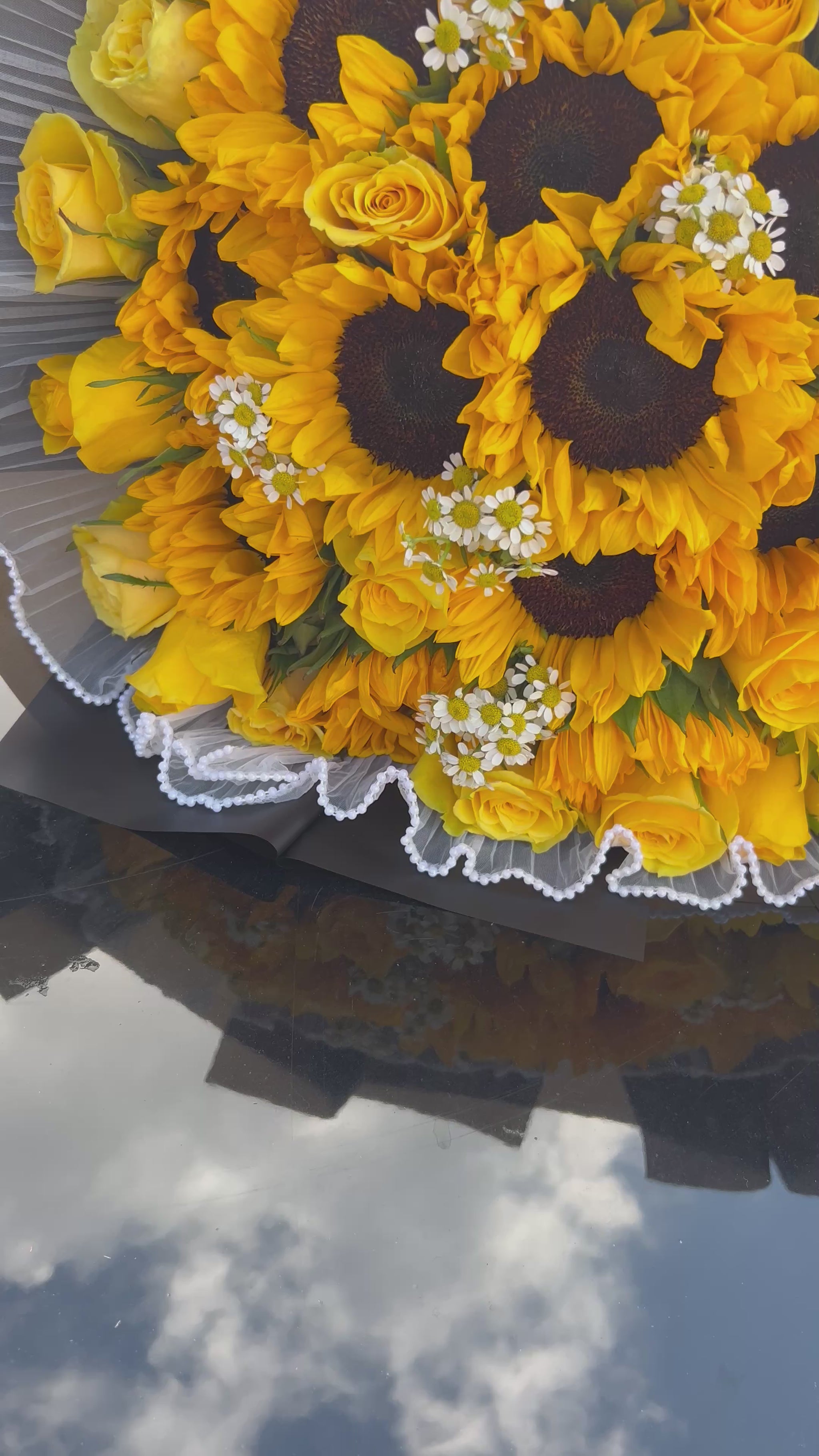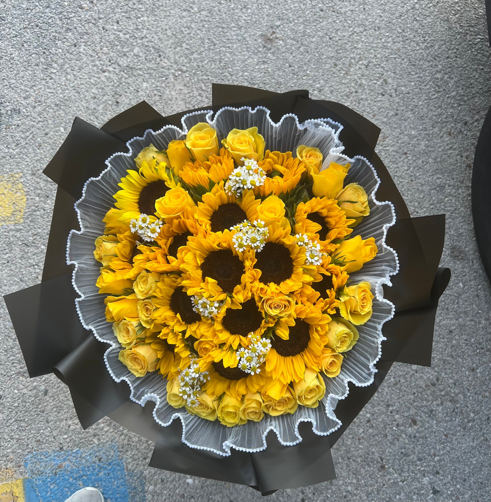 •White mesh around the bouquet
